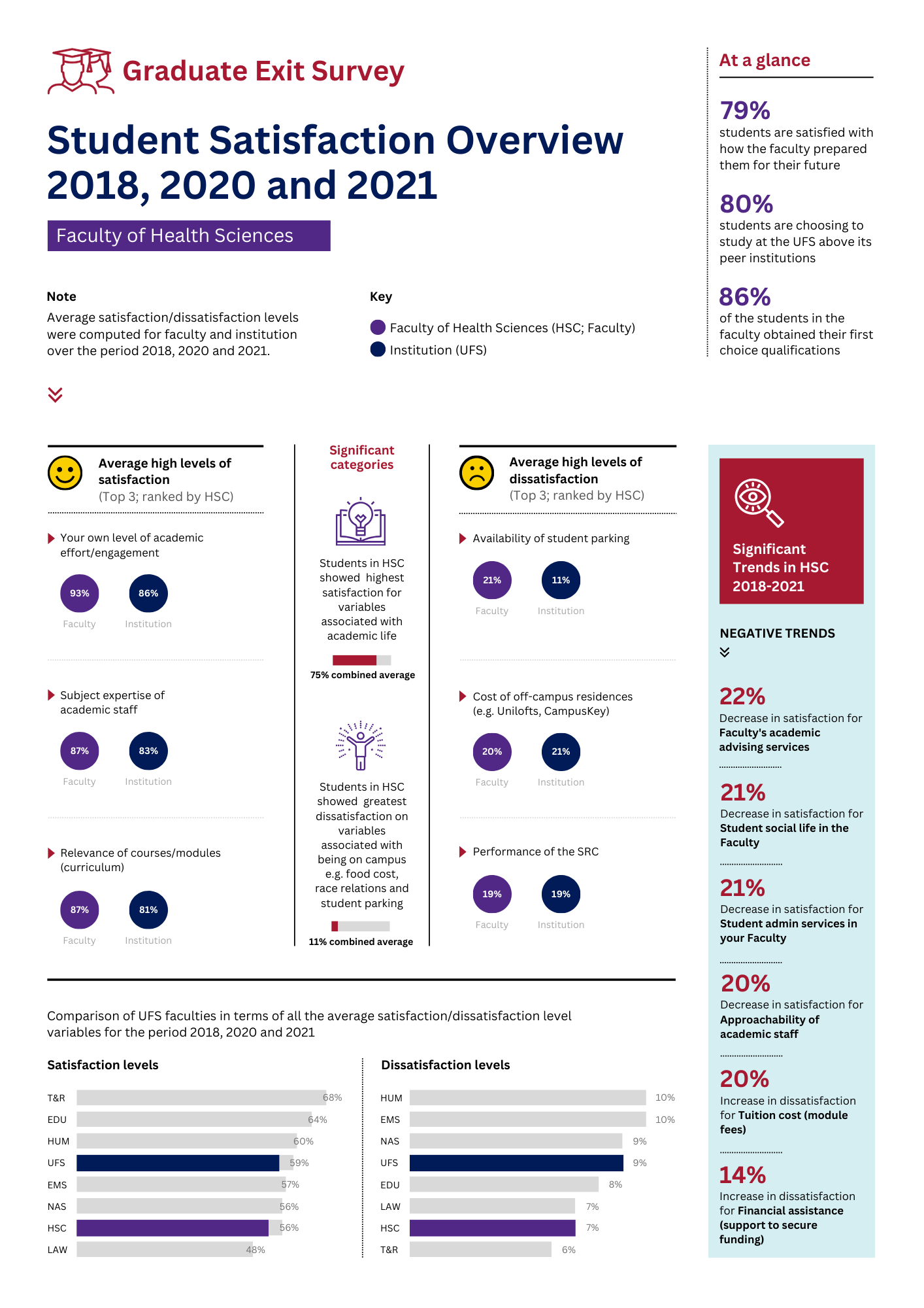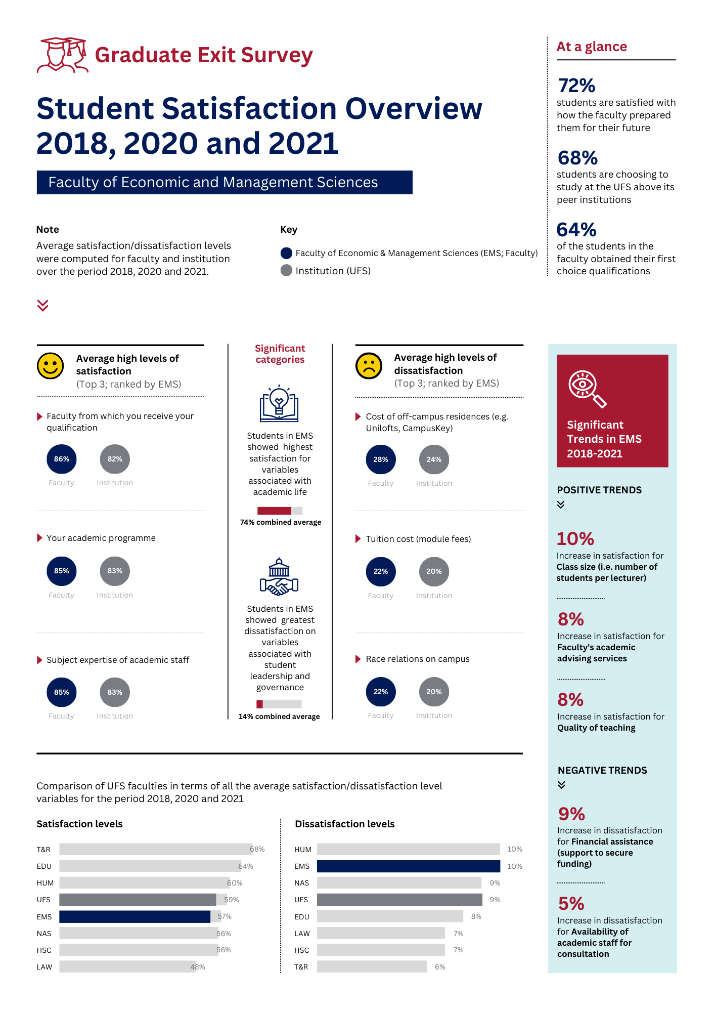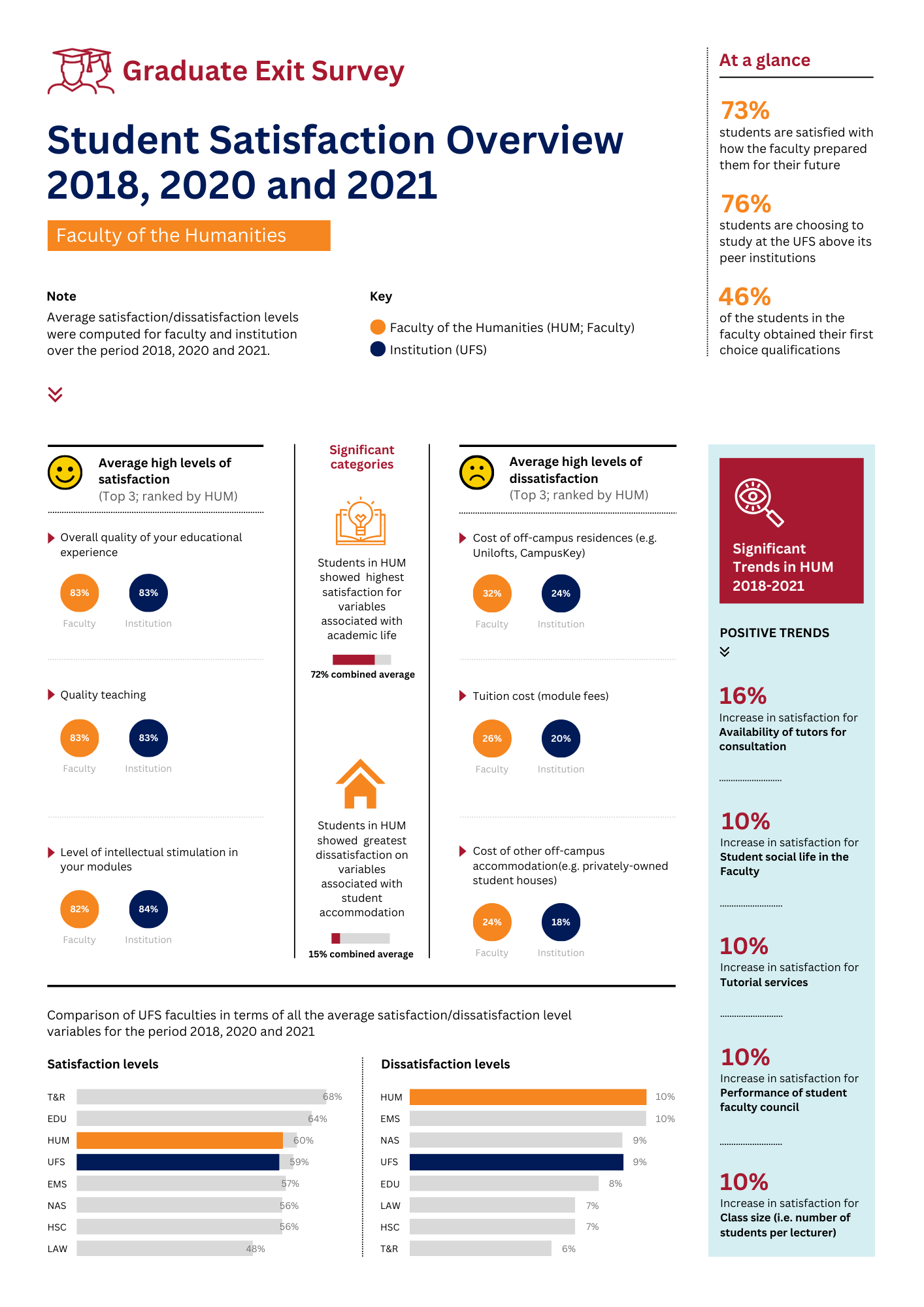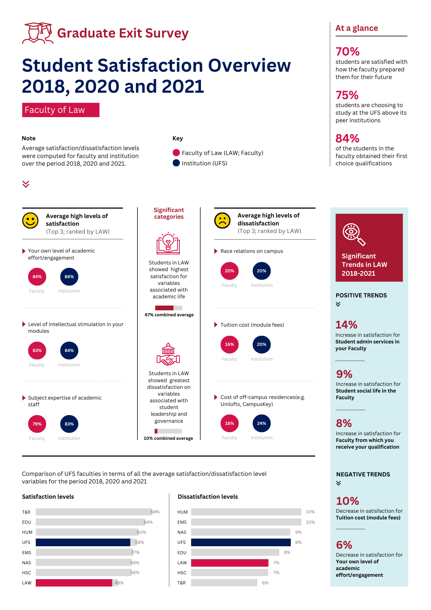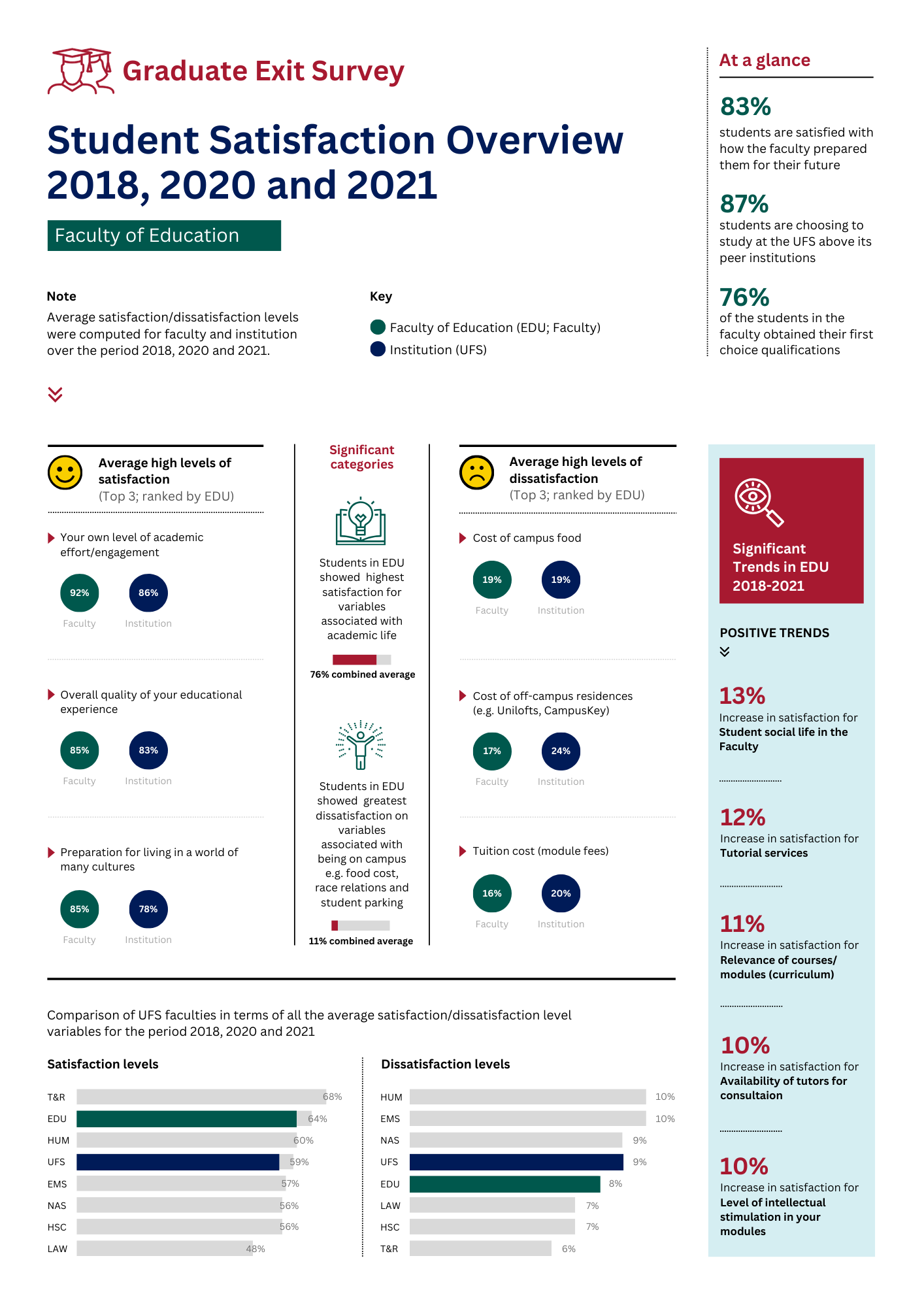 The UFS conducts the yearly Graduate Exit Survey to get feedback from the most recent graduating class about the academic and campus experience as well as their plans for the future. The Graduate Exit Survey relates to several strategies of the UFS in particular the UFS Strategic Plan and the Learning and Teaching Strategy.