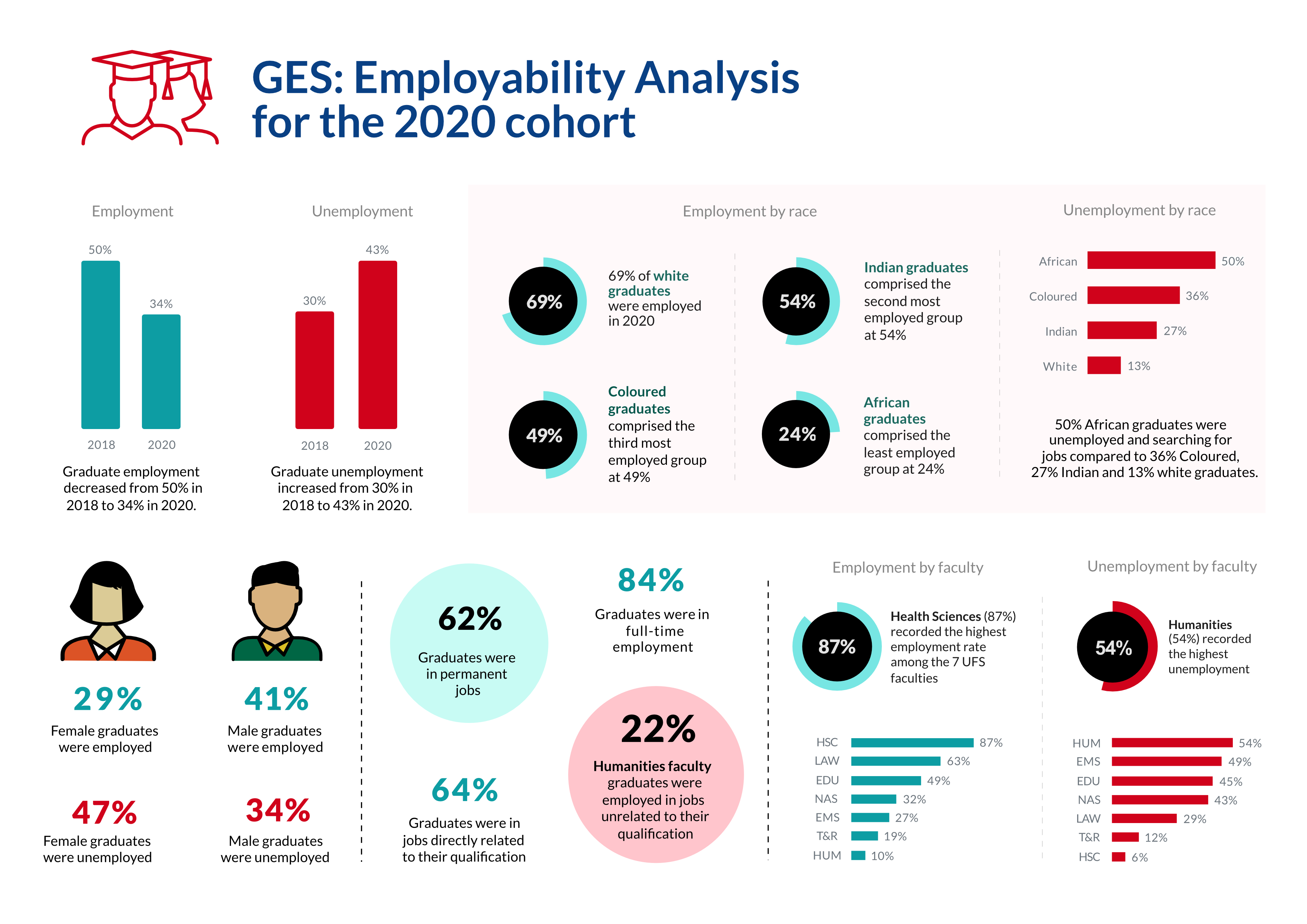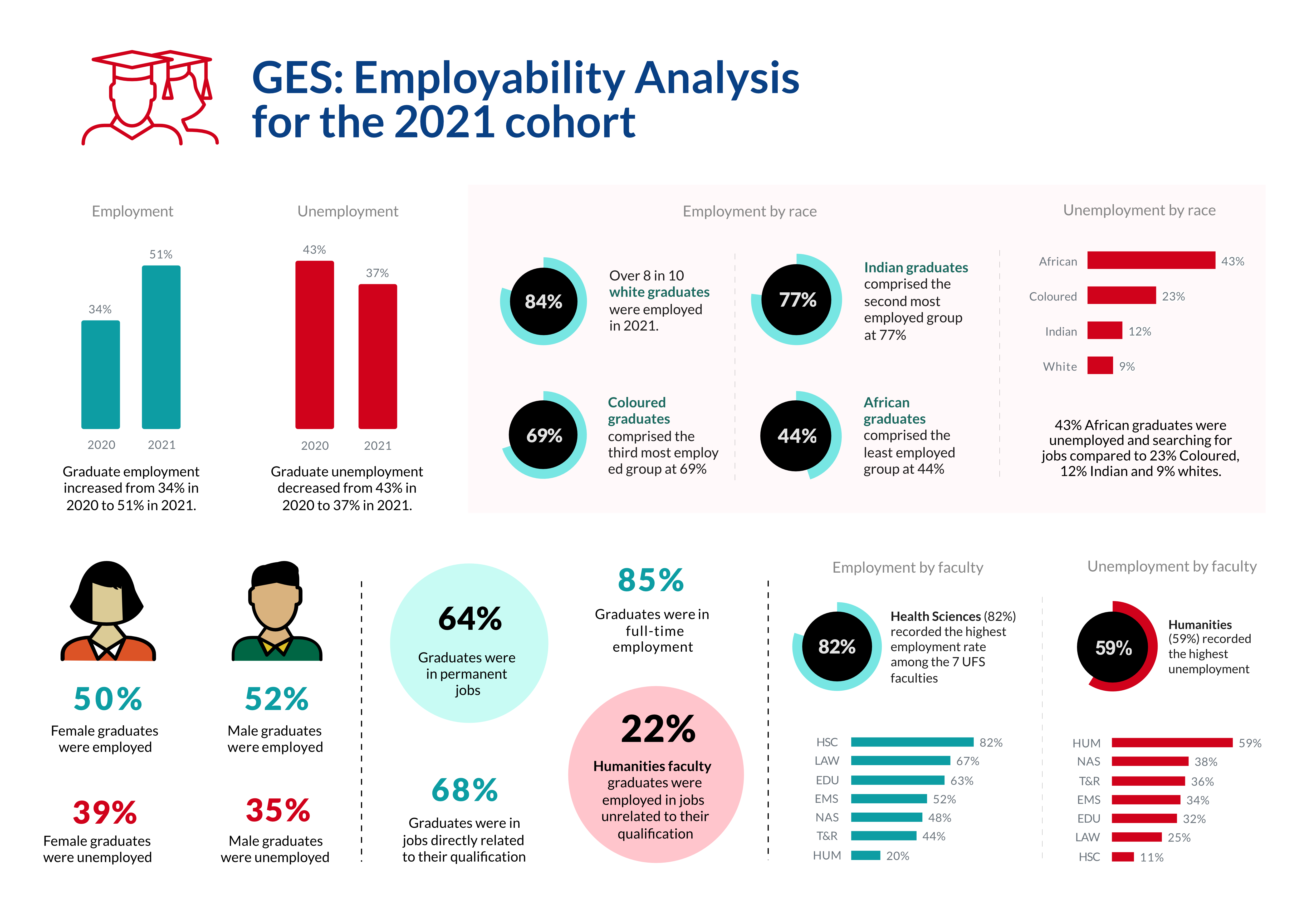 Graduate destination surveys (alumni research or tracer studies) allow researchers to collect data about the actual labour market outcomes and workplace experiences of university graduates and compare these with their expectations and plans at the time of graduation. The UFS amended its Graduate Exit Survey (GES) questionnaire to collect data about employment, future studies, satisfaction, and skills acquisition from alumni. The Graduate Destination Survey (GDS) aims to provide empirical evidence to inform interventions intended to better prepare UFS graduates for the world of work and improve their employability. Data is collected through an online survey distributed to UFS alumni registered in the UFS alumni database and all graduates who completed the GES. The findings provide the University with a better understanding of the work-life of its alumni, the transition from study to work, and the professional relevance of the graduate attributes and other skills graduates acquire at the UFS.